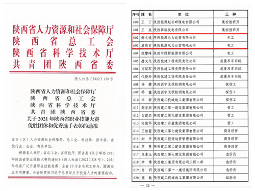本次榮獲“陜西省技術(shù)能手”的舒文通、屈曉言就是在公司職工技能大賽中涌現(xiàn)出的優(yōu)秀青年技能人才。他們曾在集團(tuán)2021年職工職業(yè)技能大賽中,榮獲電工技能競賽冠、亞軍。